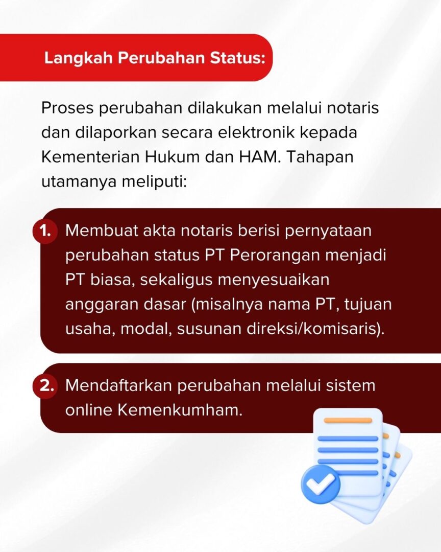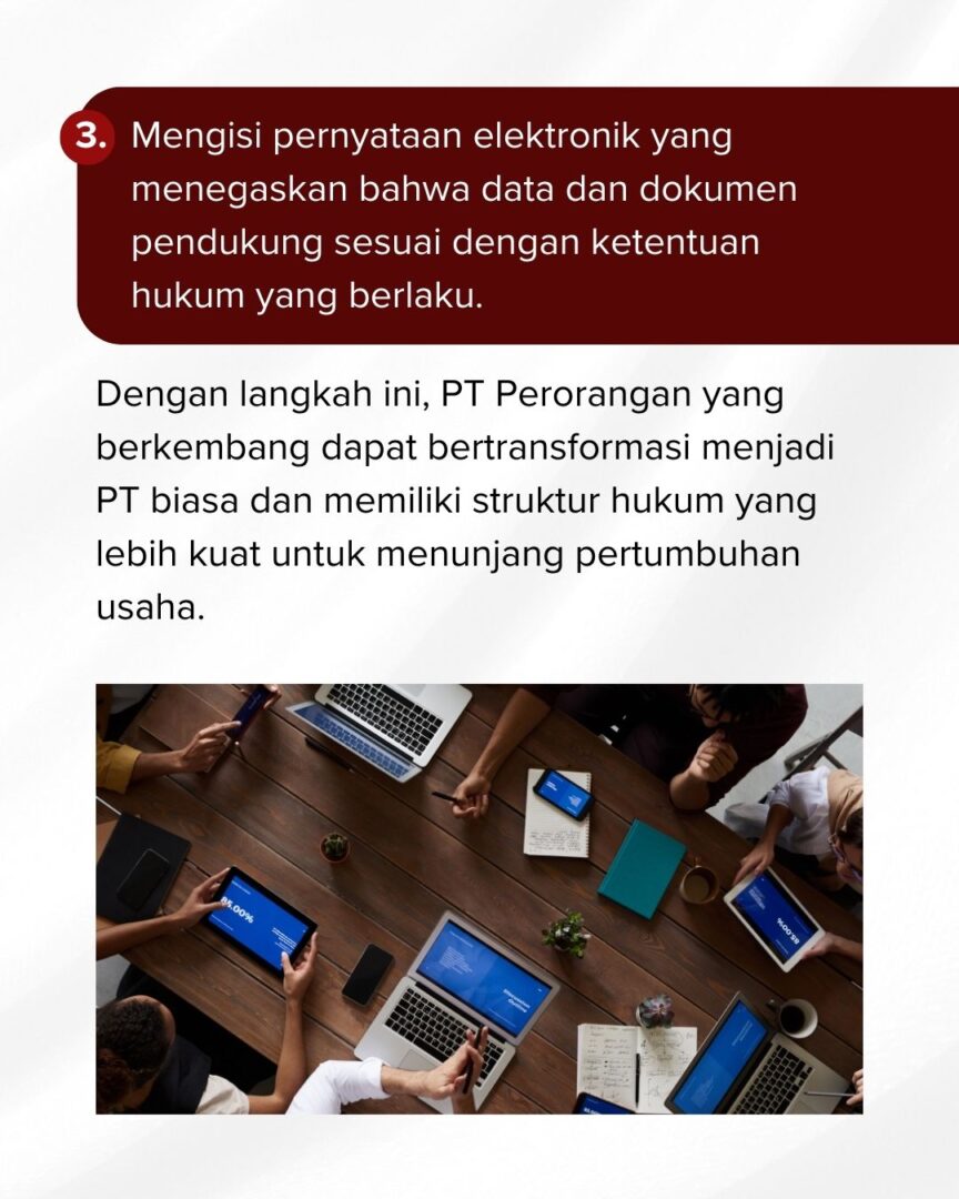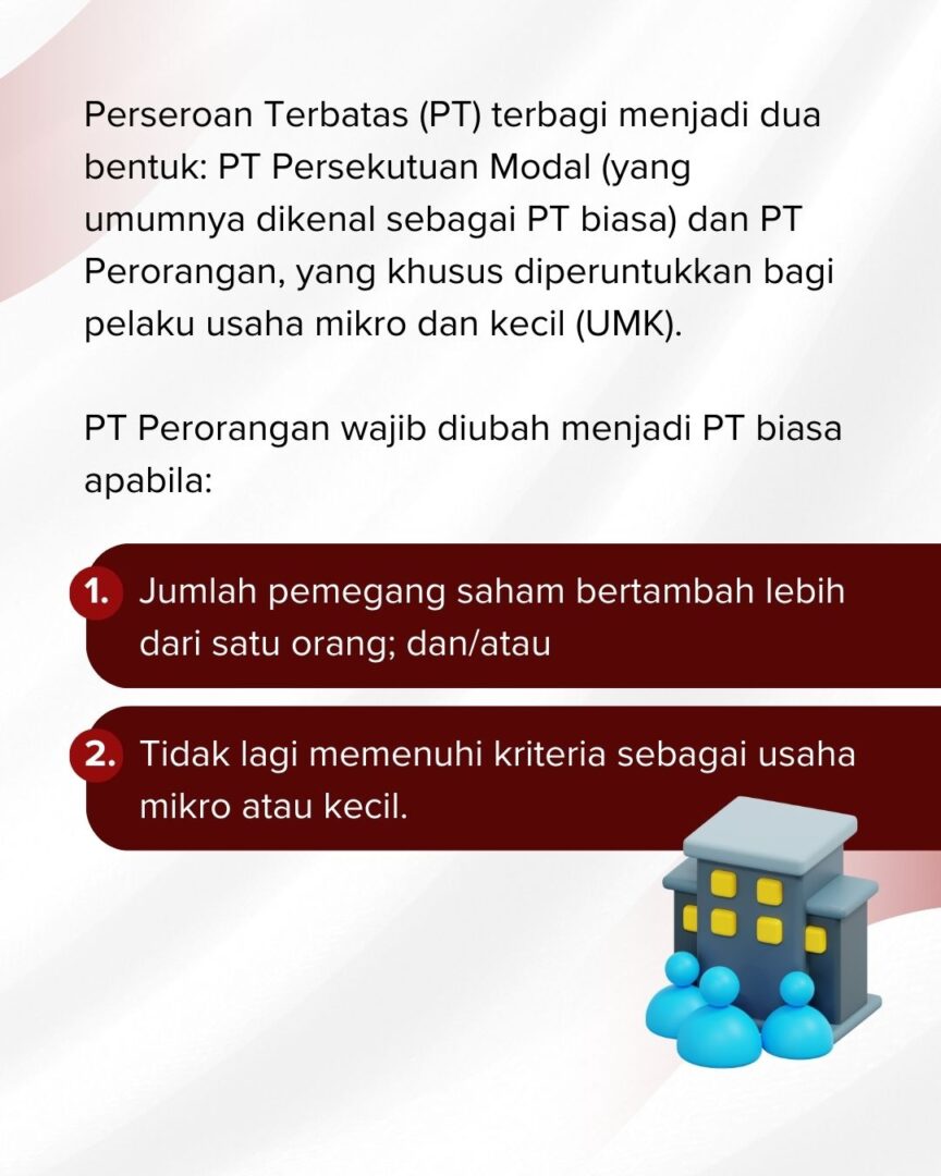 Perjalanan bisnis sering kali membawa kita ke tahap yang lebih besar. Bagi pelaku usaha dengan PT Perorangan, ada saatnya untuk bertransformasi menjadi PT biasa agar memiliki struktur hukum yang lebih kuat.