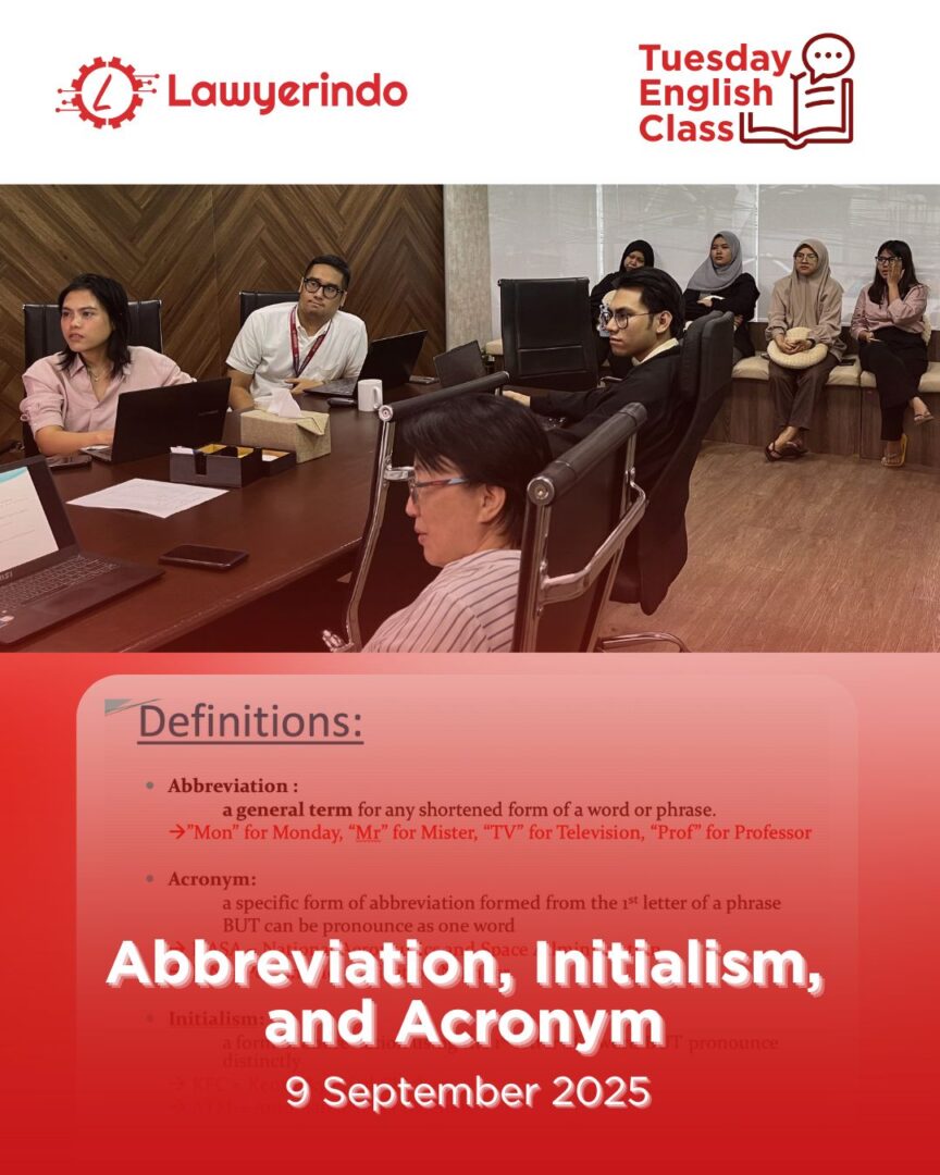 News & Events 12/09/2025 Event Tuesday English Class: Abbreviation, Initialism, and Acronym. Last Tuesday was more exciting with our Tuesday English Class! This session’s topic, “Abbreviation, Initialism, and Acronym,” gave us the Learn More 25/08/2025 Event MQM – Making Things Right at Work (Part 1) Happy Monday! At the start of the week, our Monday Quality Meeting set the tone for making things right at Learn More 22/08/2025 Event, Information TAF Class – Accounting and Taxation: An Introduction for Employees Last Friday’s #FridayTAFClass took us into the essentials of Accounting and Taxation—designed as a practical introduction for employees to strengthen Learn More 17/07/2025 Event Strategic Discussions with Interfor International We were honoured to welcome Benjamin Kunde, Executive Vice President at Interfor International, during his visit to the Lawyerindo office Learn More 26/06/2024 Event Our Bali Office is Open! Hi Kawan Lawyerindo. Exciting news for all of you! We have recently opened our new office located at Jl. Raya Learn More 25/06/2024 Event 2024 Reborn Together On Friday, 5 January 2024, we kicked off 2024 with a ‘Reborn Together’ spirit! We gathered with renewed spirits, embracing Learn More